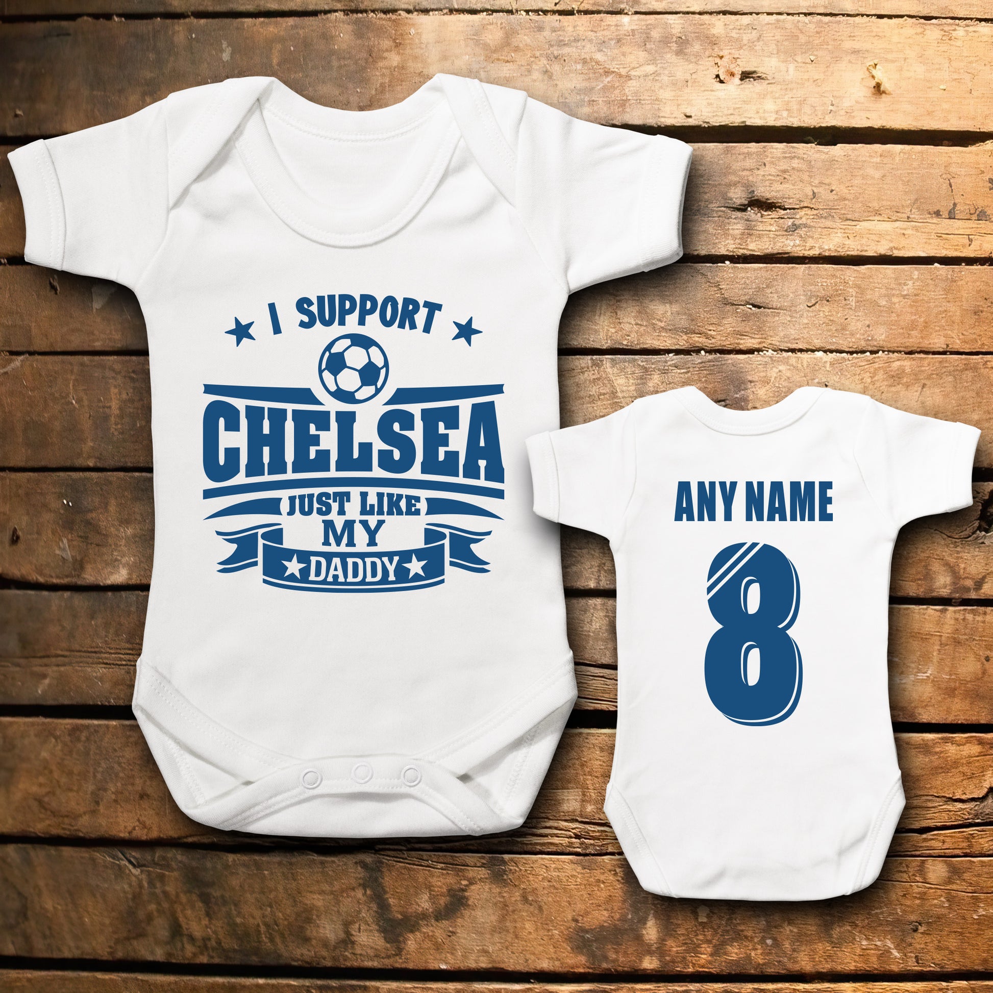 The front reads “I support Chelsea just like my Daddy” – or you can personalise it with Mummy, Grandad, or any custom wording you like.